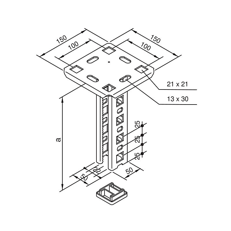 Deckenstütze bestehend aus Multifix C-Profil 50x50 verzahnt. Mit Vierkant- und Langlöchern. Abgekantete Kopfplatte quadratisch 150x150 für mehr Stabilität. Für hohe Traglasten geeignet. Befestigungsmittel M10.